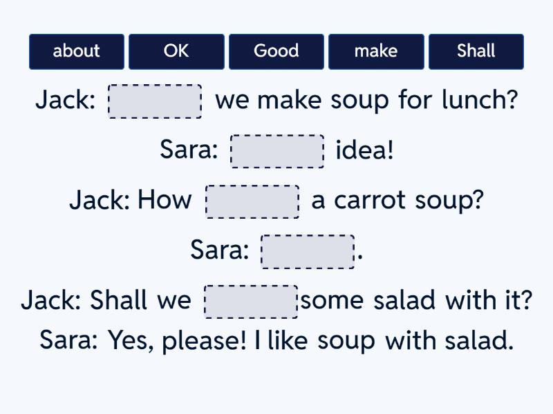 Jack: ____ we make soup for lunch? Sara: ____ idea! Jack: How ____ a carrot soup? Sara: ____. Jack: Shall we ____some salad with it? Sara: Yes, please! I like soup with salad. ____ we eat some food?Good ____! How ____ a sandwich? ____ Shall ____ add some tomatoes in the sandwich? ____, don't! I hate tomatoes.