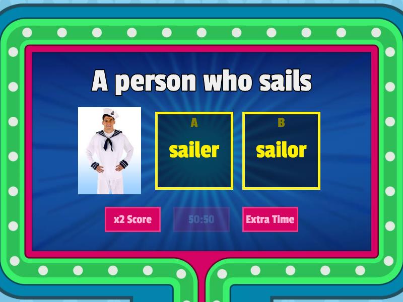 1) A person who sails a) sailer b) sailor 2) A person who swims a) swimmer b) swimmor 3) A person who acts a) acter b) actor 4) A perosn who sings a) singer b) singor 5) A person who waits tables a) waiter b) waitor 6) A person who writes book a) auther b) author 7) A person who runs a) runner b) runnor 8) A person who teaches a) teacher b) teachor 9) A person who bakes a) baker b) bakor 10) A person who illustrates a) illustrater b) illustrator 11) A person who drives a) driver b) drivor 12) A person who games a) gamer b) gamor 13) A perosn who banks a) banker b) bankor 14) A person who dances a) dancer b) dancor 15) A person who edits a) editer b) editor 16) A person who farms a) farmer b) farmor 17) A person who educates a) educater b) educator 18) A person who explores a) explorer b) exploror 19) A person that gardens a) gardener b) gardenor 20) A person who visit a) visiter b) visitor 21) A person who invents a) inventer b) inventor