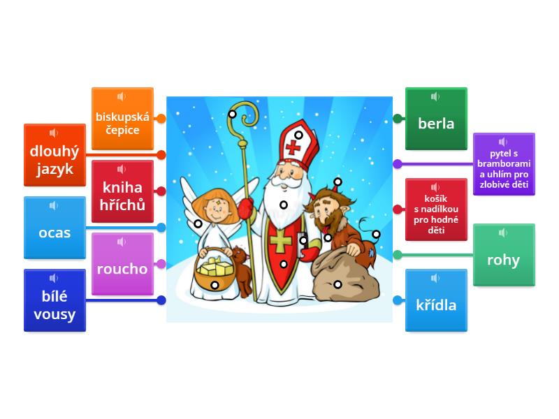 křídla, košík s nadílkou pro hodné děti, biskupská čepice, berla, roucho, bílé vousy, rohy, dlouhý jazyk, pytel s bramborami a uhlím pro zlobivé děti, ocas, kniha hříchů.