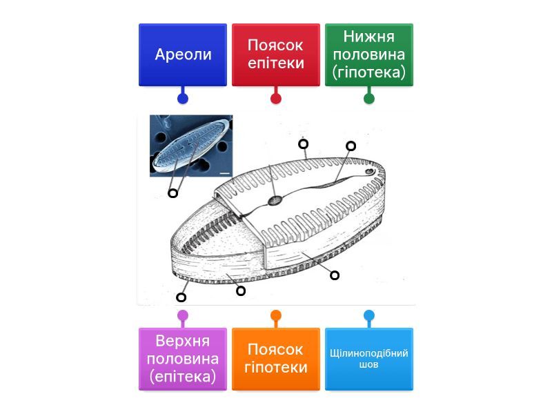 Щілиноподібний шов, Поясок епітеки, Поясок гіпотеки, Нижня половина (гіпотека), Верхня половина (епітека), Ареоли.
