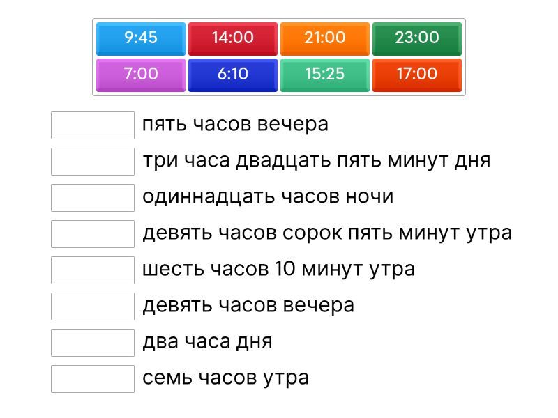 14:00 - два часа дня, 9:30 - половина десятого утра, 20:00 - восемь часов вечера, 8:30 - половина девятого утра, 23:00 - одиннадцать часов ночи, 6:10 - шесть часов 10 минут утра, 11:00 - одиннадцать часов утра, 15:25 - три часа двадцать пять минут дня, 12:00 - полдень, 7:00 - семь часов утра, 21:00 - девять часов вечера, 16:00 - четыре часа дня, 13:00 - один час дня, 17:00 - пять часов вечера, 9:45 - девять часов сорок пять минут утра,
