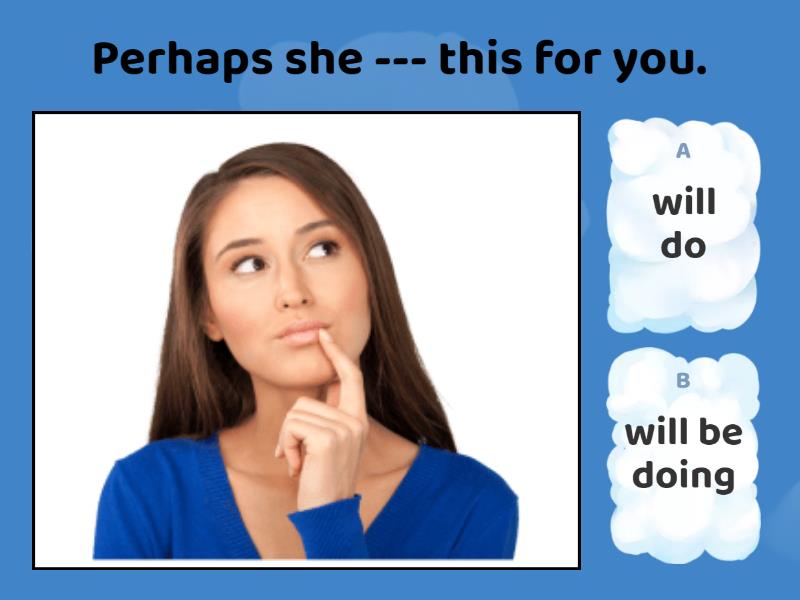 1) Perhaps she --- this for you. a) will do b) will be doing 2) They --- to the party. a) will probably go b) will probably be going 3) We --- the news at 10pm tonight. a) will watch b) will be watching 4) Maybe she --- a language course in Malta. a) will do b) will be doing 5) I'll try my best to find you at the station. What ---? a) will you wear b) will you be wearing 6) At noon tomorrow, I --- on a beach somewhere. a) will lie b) will be lying 7) I think I --- the chicken. a) will have b) will be having 8) Sorry, I can't. I --- my daughter to work at that time. a) will drive b) will be driving 9) Look, that’s my bus. I --- with you later. a) will catch up b) will be catching up 10) This time next week, I --- lunch with Mr Brown. a) will have b) will be having