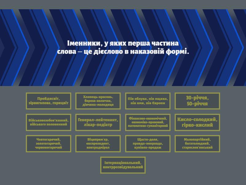 Пройдисвіт, зірвиголова, горицвіт - Іменники, у яких перша частина слова – це дієслово в наказовій формі., Пів яблука, пів ящика, пів ями, пів Європи - Іменники, що в першій частині мають префікси пів-, напів-, полу- раніше писали разом. Проте, згідно з новим правописом 2019 року, невідмінюваний числівник пів- з іменником – загальною та власною назвою у формі родового відмінка однини пишемо окремо, Малопартійний, багатолюдний, старослов’янський - Прикметники, що мають у першій частині слова багато-, мало-, старо-, ново-, давньо-, верхньо-, нижньо-, Інтернаціональний, контррозвідувальний - Прикметники з префіксами інтер-, контр- пишуться разом, Щастя-доля, правда-неправда, купівля-продаж - Іменники, утворені з двох слів, Віцепрем’єр, експрезидент, контрадмірал - За правописом 2019 слова з першим іншомовним компонентом анти-, віце-, екс-, контр-, лейб-, обер-, штабс-, унтер- пишемо разом., Генерал-лейтенант, лікар-педіатр - Іменники, що вказують на назви посад і професій, Кисло-солодкий, гірко-кислий - Смаки пишуться через дефіс, 30-річчя, 50-річчя - Іменники, що мають у складі числівники, написані цифрами, Фінансово-економічний, економіко-правовий, математико-гуманітарний - Прикметники, що складаються з двох слів, між якими можна вставити сполучник., Човтогарячий, золотогарячий, червоногарячий - Винятки, які потрібно писати разом, Військовозобов'язаний, війського полоненний - Іменники, а не прикметники, Хлопець-красень, береза-велична, дівчина-молодиця - Прикладки, що стоять після іменника і вказують на його ознаку,