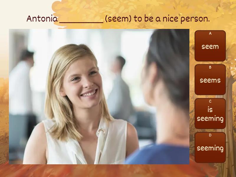 1) Antonia _________ (seem) to be a nice person. a) seem b) seems c) is seeming d) seeming 2) Do not disturb, please! My team and I ___________ (work) on a new project now. a) am working  b) work c) working d) are working 3) This __________ (be) Anthony. a) be b) is being c) is d) are 4) My boyfriend and I __________ (eat) a pizza at the moment. a) eat b) eating c) am eating d) are eating 5) Josh ___________ (prefer) tea with milk. a) prefers b) is preferring c) prefer d) is prefering 6) They ___________ (not eat) pasta every day. a) aren’t eating b) don’t eat c) doesn’t eating  d) not eating 7) Cecilia, you look so sad! What ____________ (think) about? a) is she thinking b) are you thinking c) do you think d) does you thinking 8) Honey, I can’t talk now, I ____________ (drive)! a) 'm driving b) drive c) driving d) are driving 9) The train __________ (not leave) at 7:45 on Mondays. a) isn’t leaving b) doesn’t leave c) don’t leave d) isn’t leaving  10) Look! She _________ (not sleep) in her bed! a) not sleeping  b) sleeps c) aren’t sleeping d) isn’t sleeping 11) Once a week mum ________ (prepare) pancakes for me. I love it! a) prepares b) prepare c) is preparing d) preparing 12) ___________ (read/your grandpa) the newspaper regularly? a) your grandpa reading b) is your grandpa reading c) does your grandpa read d) does your grandpa reads 13) _________ (they/sit) in the garden? No, look! a) are they sitting b) do they sit c) are sitting d) are they siting  14) Lucas never _________ (go) to the cinema alone. a) go b) goes c) is going d) are going  15) My friend Marina _____________ (work) as a secretary in a big company. a) working b) is working c) work d) works 16) We ____________ (not study) volcanoes this week at school. a) not studying b) don't study  c) aren’t studying d) aren’t studing  17) We______________ homework together this afternoon. a) are doing b) do c) is doing d) are do