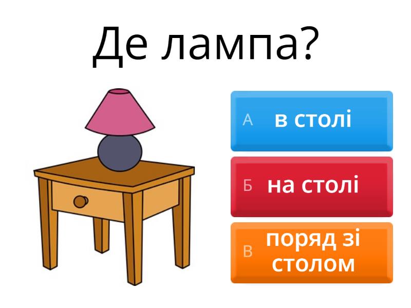 1) Де лампа? a) в столі b) на столі c) поряд зі столом 2) Де стільці? a) під столом b) в столі c) поряд зі столом 3) Де миша? a) під диваном b) на дивані c) в дивані 4) Де одяг? a) у шафі b) поряд із шафою c) за шафою 5) Де вікно? a) попереду дивана b) за диваном c) поряд з диваном 6) Де кіт? a) під стільцем b) в стільці c) на стільці 7) Де іграшки? a) поряд з коробкою b) в коробці c) на коробці 8) Де килим? a) на підлозі b) позаду столу c) на стіні