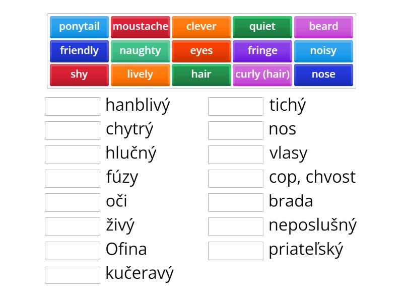 beard - brada, nose - nos, eyes - oči, hair - vlasy, clever - chytrý, curly (hair) - kučeravý, friendly - priateľský, fringe - Ofina, lively - živý, moustache - fúzy, naughty - neposlušný, noisy - hlučný, ponytail - cop, chvost, quiet - tichý, shy - hanblivý,