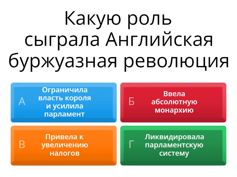 1) Какую роль сыграла Английская буржуазная революция a) Ограничила власть короля и усилила парламент b) Ввела абсолютную монархию c) Привела к увеличению налогов d) Ликвидировала парламентскую систему 2) Какое государственное устройство было установлено в Англии после революции? a) Абсолютная монархия b) Республика c) Федерация d) Конституционная монархия 3) Что такое буржуазия? a) Класс землевладельцев b) Класс рабочих и крестьян c) Класс торговцев d) Класс духовенства 4) Какую роль играла буржуазия в промышленной революции? a) Укрепила феодальные порядки b) Поддерживала крестьянские восстания c) Препятствовала экономическому прогрессу d) Способствовала развитию промышленности и технологий 5) Какое влияние оказала буржуазия на политические процессы в Европе? a) Увеличила влияние монархии b) Стала движущей силой за демократические реформы c) Привела к усилению аристократии d) Сократила права граждан 6) Как промышленная революция способствовала укреплению Англии как мирового лидера? a) Развитие индустрии и торговли b) Завоевание новых земель c) Увеличение рождаемости d) Восстановление феодализма 7) Какие ресурсы играли ключевую роль в промышленной революции Англии? a) Золото и серебро b) Дерево и уголь c) Уголь и железо d) Нефть и газ 8) Какая отрасль была лидирующей в Англии в начале промышленной революции? a) Пищевая промышленность b) Военная промышленность c) Судостроение d) Текстильная промышленность 9) Какое изобретение способствовало развитию текстильной промышленности в Англии? a) Телеграф b) Параход c) Прядильная машина d) Паровая турбина  10) Как Англия использовала свои колонии для укрепления своей экономики? a) Как источник сырья и рынки сбыта b) Для заселения рабочих c) Для выращивания продовольствия d) Как военные базы 11) Как Великобритания сохранила лидерство в производстве? a) Использовала рабский труд b) Внедрила механизацию и новые технологии c) Ограничила экспорт технологий d) Увеличивала свои колонии  12) Что стало основой для проникновения англичан в Индию в начале XVII века? a) Открытие нового морского пути в Индию b) Военное завоевание прибрежных территорий c) Торговые привилегии, полученные от Великих Моголов d) Союз с Португалией для торговли специями 13) Какая компания играла ключевую роль в колонизации Индии Англией? a) Ост-Индская компания b) Британская торговая гильдия c) Лондонская купеческая гильдия d) Трансокеанская компания 14) Какое событие стало началом перехода англичан от торговли к контролю над индийскими территориями? a) Битва при Ватерлоо b) Осада Мадраса c) Индийское восстание 1857 года d) Битва при Плесси 15) Какая политика помогла англичанам укрепить своё влияние в Индии? a) Политика культурной ассимиляции b) Заключение равноправных договоров с индийскими правителями c) Разделяй и властвуй d) Политика свободной торговли 16) Чем была богата Индия ? a) драгоценные камни и хлопок b) Специи и чай  c) Индиго d) все выше сказанное 17) Какой из этих философов является представителем Эпохи Просвещения? a) Томас Гобсс b) Жан-Жак Руссо c) Платон d) Гумелев  18) Какая идея была центральной для мыслителей Эпохи Просвещения? a) Абсолютная монархия b) Божественное право королей c) Вера в силу разума и прогресса d) Церковное руководство государством 19) Какая страна стала центром распространения идей Просвещения в XVIII веке? a) Испания b) Франция c) Португалия d) Ш