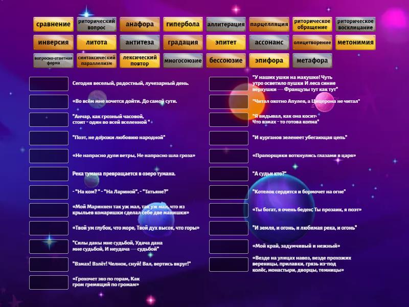 гипербола - "Я видывал, как она косит: Что взмах - то готова копна", литота - «Мой Маринхен так уж мал, так уж мал, что из крыльев комаришки сделал себе две манишки», эпифора - "Силы даны мне судьбой, Удача дана мне судьбой, И неудача — судьбой", анафора - «Не напрасно дули ветры, Не напрасно шла гроза», эпитет - «Мой край, задумчивый и нежный», метафора - «Прапорщики воткнулись глазами в царя», олицетворение - "Котелок сердится и бормочет на огне", сравнение - "Анчар, как грозный часовой, стоит - один во всей вселенной ", парцелляция - «Во всём мне хочется дойти. До самой сути., метонимия - "Читал охотно Апулея, а Цицерона не читал", многосоюзие - "И земля, и огонь, и любимая река, и огонь", бессоюзие - «Везде на улицах навоз, везде прохожих вереницы, прилавки, грязь из-под колёс, монастыри, дворцы, темницы», риторический вопрос - "А судьи кто?", риторическое восклицание - "Взмах! Взлёт! Челнок, снуй! Вал, вертись вкруг!", риторическое обращение - "Поэт, не дорожи любовию народной", антитеза - «Ты богат, я очень беден; Ты прозаик, я поэт», инверсия - "И курганов зеленеет убегающая цепь", лексический повтор - Река тумана превращается в озеро тумана., градация - Сегодня веселый, радостный, лучезарный день., синтаксический параллелизм - «Твой ум глубок, что море, Твой дух высок, что горы», ассонанс - "У наших ушки на макушке! Чуть утро осветило пушки И леса синие верхушки — Французы тут как тут", аллитерация - «Грохочет эхо по горам, Как гром гремящий по громам», вопросно-ответная форма - - "На ком? " - "На Лариной". - "Татьяне?",