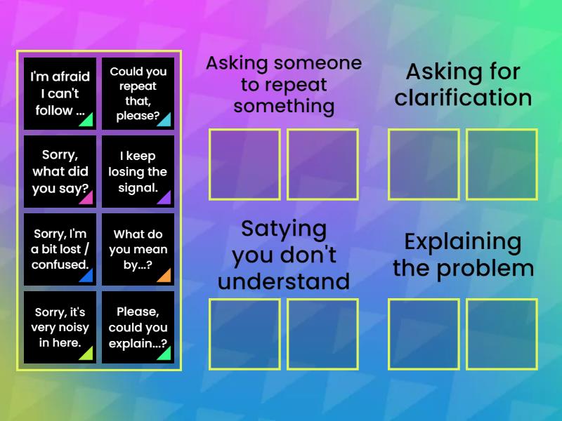Asking someone to repeat something: Sorry, what did you say?, Could you repeat that, please?, Asking for clarification: What do you mean by...?, Please, could you explain...?, Satying you don't understand: I'm afraid I can't follow ..., Sorry, I'm a bit lost / confused., Explaining the problem: Sorry, it's very noisy in here., I keep losing the signal.,
