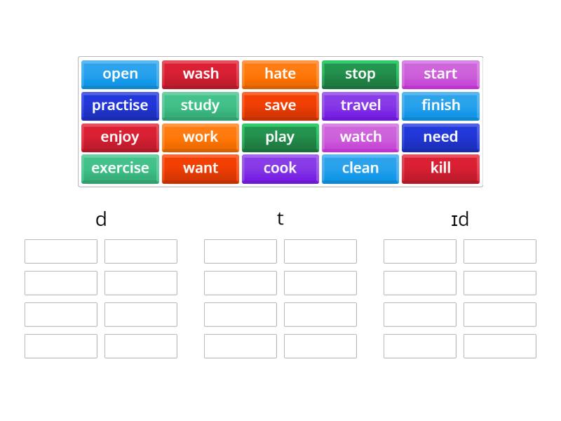 d: enjoy , play, kill, travel, open, clean, save, t: watch, stop, work, finish, practise, exercise, cook, wash, ɪd: start , hate, need , want, study,