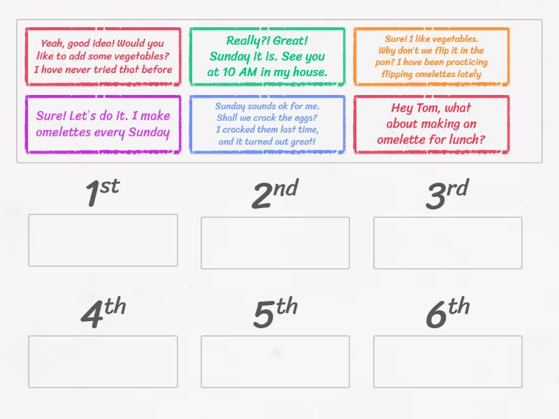 Hey Tom, what about making an omelette for lunch? , Sure! Let’s do it. I make omelettes every Sunday, Sunday sounds ok for me. Shall we crack the eggs? I cracked them last time, and it turned out great!, Yeah, good idea! Would you like to add some vegetables? I have never tried that before, Sure! I like vegetables. Why don’t we flip it in the pan? I have been practicing flipping omelettes lately, Really?! Great! Sunday it is. See you at 10 AM in my house..