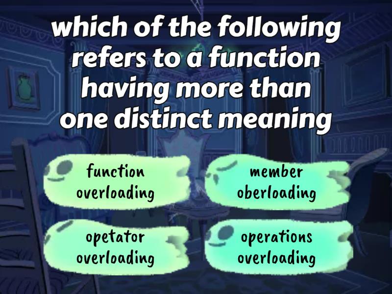 1) which of the following refers to a function having more than one distinct meaning a) function overloading b) member oberloading c) opetator overloading d) operations overloading 2) which of the following reduces the number of comparison in a program a) operator overloading b) operation overloading c) Function overloading  d) member overloading 3) void dispchar(char ch=`$', int size=10) { for (int i=l ;i++) cout << ch ; } how will you invoke the function dispchar () of the following inputs? To print $ for 10 times a) dispchar(); b) dispchat(ch, size); c) dispchar($, 10); d) dispchar('$', 10 times); 4) which of the following is not true with respect to overloading a) the overloaded function must differ in their signature b) the return type is also considered for overloading a function c) the default arguments of overloaded function are not considered for overloading d) destructor function cannot be overloaded 5) which of the following is invalid prototype for overloading function a) void fun (intx); void fun (char ch); b) void fun (intx); void fun (inty); c) void fun (double) void fun (char ch); d) ;d) void fun (double d); void fun (inty);