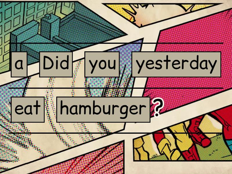 Did you eat a hamburger yesterday?, Did she play soccer last week?, Did we practise for the exam?, Did they dance in the party?, They didn´t dance in the party., We didn´t practise for the exam., She didn´t play soccer last week., I didn't eat a hamburger yesterday.,