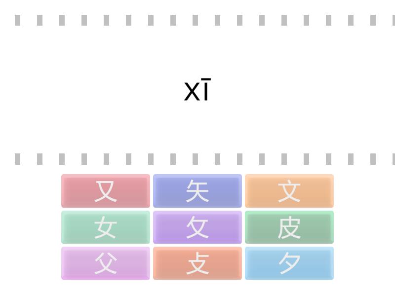 夕 - xī , 又 - yòu , 文 - wén , 皮 - pí , 父 - fù , 矢 - shǐ , 女 - nǚ , 攴 - --, 攵 - - --,