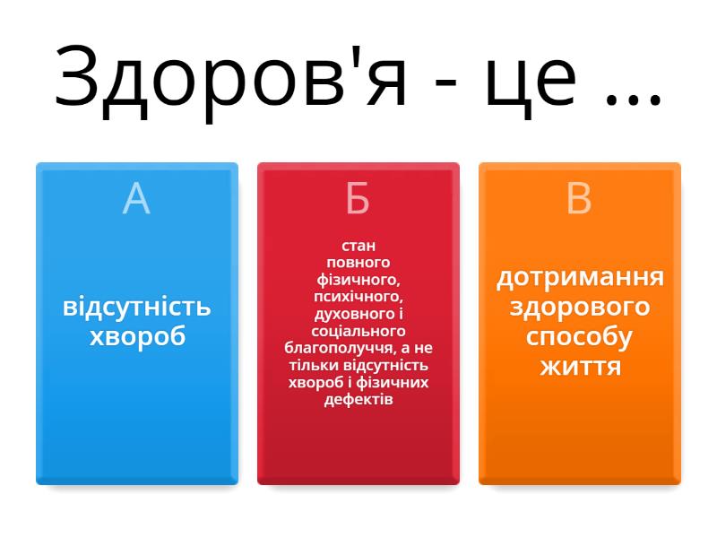 1) Здоров'я - це ... a) відсутність хвороб b) стан повного фізичного, психічного, духовного і соціального благополуччя, а не тільки відсутність хвороб і фізичних дефектів c) дотримання здорового способу життя 2) Оберіть 5 основних принципів здорового способу життя a) усвідомлене харчування, вибір якісних продуктів, зміна психічних відносин, регулярні фізичні навантаження та вправи на розслаблення, турбота про правильну кількість сну b) почати день із поживного сніданку, кардіо-вправи, релаксація, відсутність стресу, висока самооцінка c) загартовування, міцний сон, силові вправи, фізичне здоров'я, достатня кількість води 3) Спосіб життя - це ... a) збереження здоров'я і гармонійний розвиток b) висока працездатність, створення міцної сім'ї c) сукупність стійких форм життєдіяльності людини, які визначають її життєвий шлях 4) На скільки відсотків стан здоров'я людини залежить від її способу життя? a) 70 b) 50 c) 30 5) В основі здорового способу життя лежать такі принципи : a) раціональне харчування b) відсутність шкідливих звичок c) загартовування 6) Найбільш шкідлива звичка, яка може сформуватись у шкільному віці a) куріння b) вживання алкоголю c) вживання наркотичних речовин 7) Оберіть формулу здорового способу життя a) зберігати, розвивати, відновлювати b) харчуватися, займатися спортом, спати c) самовдосконалення, саморозвиток, самооцінка 8) Яка фізична активність є оптимальною для підлітків? (за даними ВООЗ) a) 120 хв в день b) 60 хв в день c) 150 хв в тиждень 9) Вживання яких продуктів треба обмежити для збалансованого харчування? a) овочі, фрукти, цільнозернові продукти b) м'ясо, бобові c) цукор, сіль, насичені жири 10) За якою формулою можна розрахувати кількість вживання води в день? a) 30 мл х 1 кг ваги тіла b) 50 мл х 1 кг ваги тіла c) 100 мл х 1 кг ваги 11) Яка з цих груп продуктів є основою для збалансованого харчування? a) лише м'ясо b) тільки десерти c) овочі, фрукти, зернові, білки 12) Що таке макронутрієнти? a) це основні компоненти їжі, які забезпечують організм енергією і необхідні для його функціонування b) це поживні речовини, які містяться в малих кількостях, але вони грають критично важливу роль у підтримці здоров'я і нормально функціонування c) це органічні сполуки, які містяться в малих кількостях для підтримки нормального функціонування організму