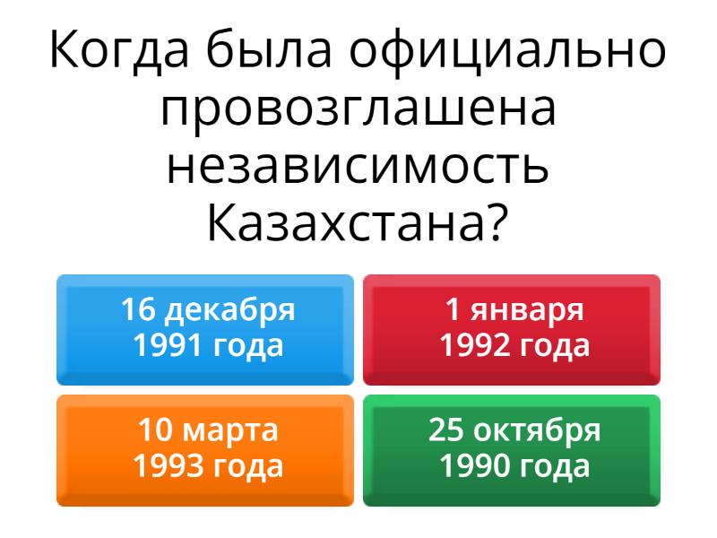 1) Когда была официально провозглашена независимость Казахстана? a) 16 декабря 1991 года b) 1 января 1992 года c) 10 марта 1993 года d) 25 октября 1990 года 2) Какой документ стал основой для проведения экономических реформ в Казахстане в начале 1990-х годов? a) Конституция РК b) Закон о приватизации c) План «Казахстан-2030» d) Декларация о государственном суверенитете 3) Какой крупный город стал столицей Казахстана в 1997 году? a) Шымкент b) Алматы c) Астана d) Караганда 4) Какое событие произошло в Казахстане в 1986 году и стало важным этапом в борьбе за независимость? a) Голодомор b) Жемқорлық c) Желтоксанские события d) Аральская катастрофа 5) Кто из следующих президентов Казахстана был первым? a) Нурсултан Назарбаев b) Тургунбай Сыздыков c) Касым-Жомарт Токаев d) Динмухамед Қонаев 6) Какой проект был запущен в Казахстане в 2010 году с целью интеграции страны в мировую экономику? a) Экономический паспорт Казахстана b) «Нурлы жол» c) «100 конкретных шагов» d) «Казахстан-2050» 7) Какой природный ресурс стал основным экспортным товаром Казахстана в постсоветский период? a) Уголь b) Нефть c) Уран d) Золото