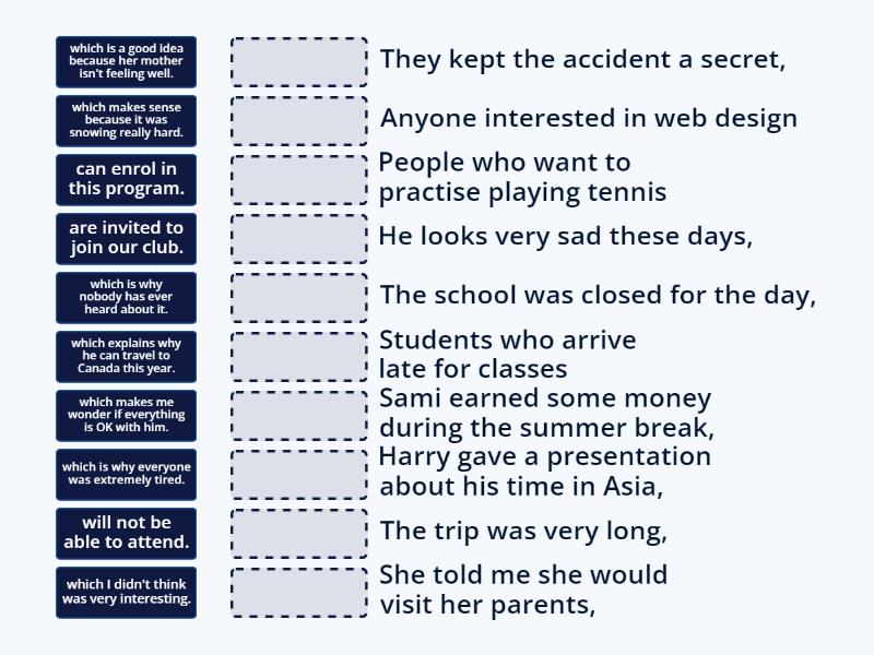 can enrol in this program. - Anyone interested in web design, which is a good idea because her mother isn't feeling well. - She told me she would visit her parents,, which I didn't think was very interesting. - Harry gave a presentation about his time in Asia,, which explains why he can travel to Canada this year. - Sami earned some money during the summer break,, which is why everyone was extremely tired. - The trip was very long,, which makes me wonder if everything is OK with him. - He looks very sad these days,, will not be able to attend. - Students who arrive late for classes, which is why nobody has ever heard about it. - They kept the accident a secret,, which makes sense because it was snowing really hard. - The school was closed for the day,, are invited to join our club. - People who want to practise playing tennis,