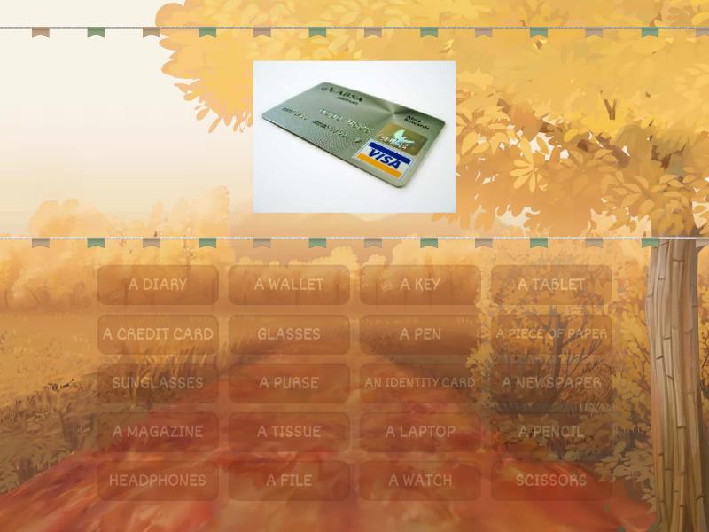 A CREDIT CARD , A DIARY, A FILE , GLASSES, HEADPHONES, AN IDENTITY CARD, A KEY , A MAGAZINE, A NEWSPAPER, A PEN, A PENCIL, A PIECE OF PAPER , A PURSE, A WATCH, A WALLET, A TISSUE, SCISSORS, SUNGLASSES, A LAPTOP, A TABLET,