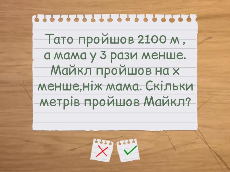 За 1 м дроту заплатили 300 грн. Скільки буде коштувати х метрів дроту? - 300*х гривень, Майкл прочитав х книжок. Дженіфер прочитала у 3 рази більше, ніж Майкл. Скільки сторінок прочитала Дженіфер? - х*3 сторінок, Тато пройшов 2100 м , а мама у 3 рази менше. Майкл пройшов на х менше,ніж мама. Скільки метрів пройшов Майкл? - 250 м,