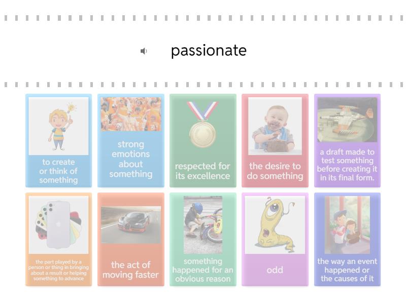 strong emotions about something - passionate, the desire to do something - impulse, the part played by a person or thing in bringing about a result or helping something to advance - contribution, respected for its excellence  - distinguished, odd - eccentric, the way an event happened or the causes of it - circumstances, something happened for an obvious reason - evidently, the act of moving faster - acceleration, a draft made to test something before creating it in its final form. - prototype, to create or think of something - conceived,