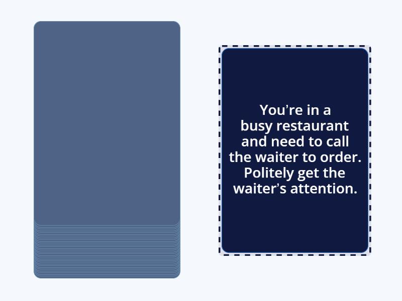 You meet a friend after an English class. Suggest you go for a meal., You see a friend you haven’t seen for a long time. Greet him/her and ask about his/her life., You are in a supermarket. You need to buy some brushes but you can’t find any. Ask the shop assistant for help., You are on a tram. Ask a fellow passenger which stop you need for the hospital., It’s a nice spring day. Ask your friend to go for a walk., You are in a hurry to go to the airport. Ask your friend whether he/she has seen your passport., You are at a train station and need to get to the city center. Ask a passerby for directions., You are looking for a specific book in a bookstore. Ask the shop assistant for help., You’re at a café with a friend. Suggest trying a new dessert on the menu., You’re meeting a colleague at work. Ask them about the new project you’re both working on., You’re in a clothing store. Ask the shop assistant if they have a different size of a shirt you like., You are lost in a new city. Ask someone how to get to the nearest bus stop., You’re about to leave for a holiday and ask your friend to water your plants while you’re away., You’re at a job interview. The interviewer asks you why you want the job. Respond politely., You’re in a busy restaurant and need to call the waiter to order. Politely get the waiter’s attention., You’re checking into a hotel. Ask the receptionist if breakfast is included in your booking., You are at a job fair. Introduce yourself to a company representative and ask about job opportunities., You are ordering a coffee but don’t know what’s in one of the drinks on the menu. Ask the barista to explain it., You’re at a museum but don’t know where the art gallery section is. Ask a museum guide for directions., You’re buying a bus ticket but aren’t sure how much it costs. Ask the ticket seller about the price., You meet a friend at the gym. Suggest trying a new exercise class together., You’re at a library and need to print a document. Ask the librarian how to do it., You are new at work and need help finding the meeting room. Ask a colleague for directions., You’re at the airport, and you’re not sure about the baggage weight limit. Ask a staff member for information., You’ve moved to a new area and see a neighbor in the elevator. Introduce yourself and ask about nearby grocery stores., You’re in a foreign city and want to try a popular restaurant. Ask a local for recommendations., You meet your friend on the street. Greet him/her. Ask if he/she would like to go to a café., You are in a coffee house. You’re hungry. Ask if they serve food., You are at your friend’s house. Ask if you can have some water., You are walking on the street. You see someone drop a pen. Tell him/her., You are in a travel agent’s. Ask if they organize holidays to Cuba., You are in a meeting at work. You suddenly feel ill..