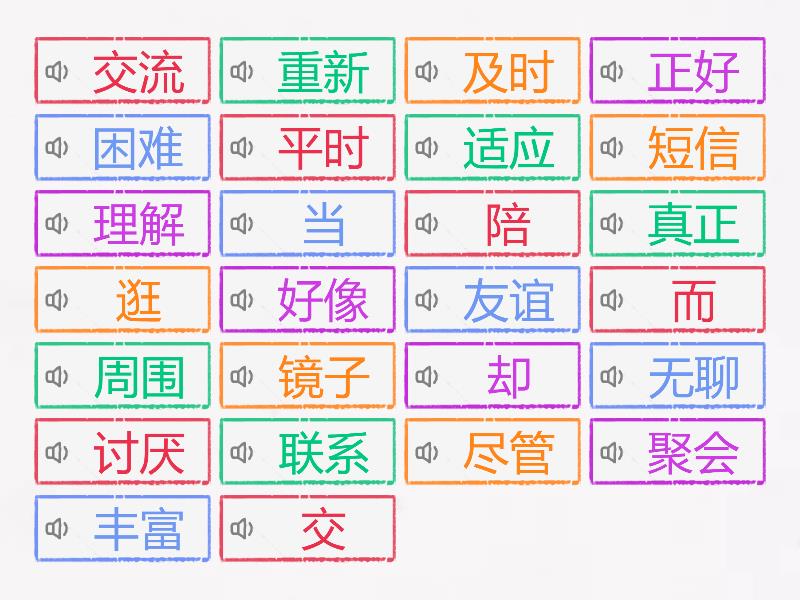 聚会 - jù huì, 联系 - lián xì, 好像 - hăoxiàng, 重新 - chóng xīn, 尽管 - jinguăn, 真正 - zhēn zhèng, 友谊 - yǒu yì, 理解 - lǐ jiě, 镜子 - jìng zi, 而 - ér, 困难 - kùn nan, 及时 - jí shí, 陪 - péi, 当 - dāng, 丰富 - fēng fù, 无聊 - wú liáo, 讨厌 - tǎo yàn, 却 - què, 交流 - jiāo liú, 周围 - zhōu wéi, 适应 - shì yìng, 交 - jiāo, 平时 - píng shí, 逛 - guàng, 短信 - duǎn xìn, 正好 - zhèng hǎo,