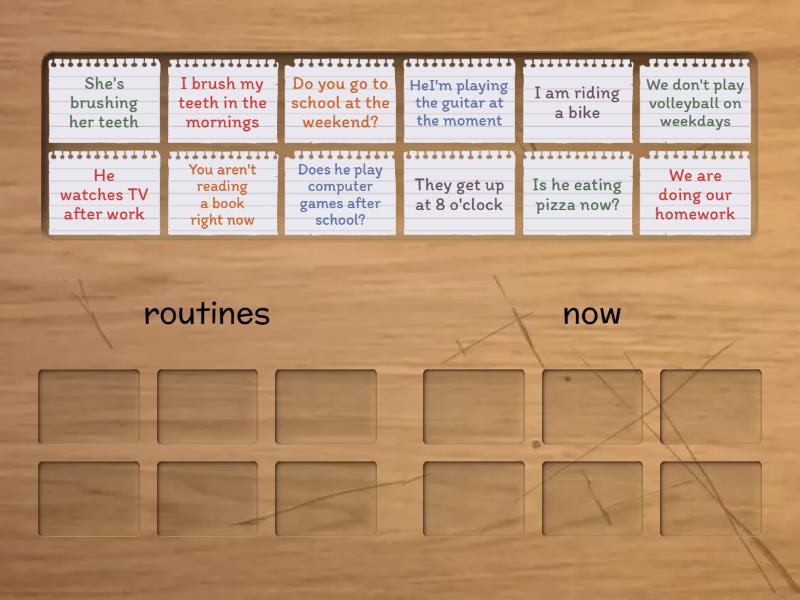 routines: I brush my teeth in the mornings, He watches TV after work, We don't play volleyball on weekdays, Do you go to school at the weekend?, They get up at 8 o'clock, Does he play computer games after school?, now: She's brushing her teeth, We are doing our homework, I am riding a bike, HeI'm playing the guitar at the moment, You aren't reading a book right now, Is he eating pizza now?,