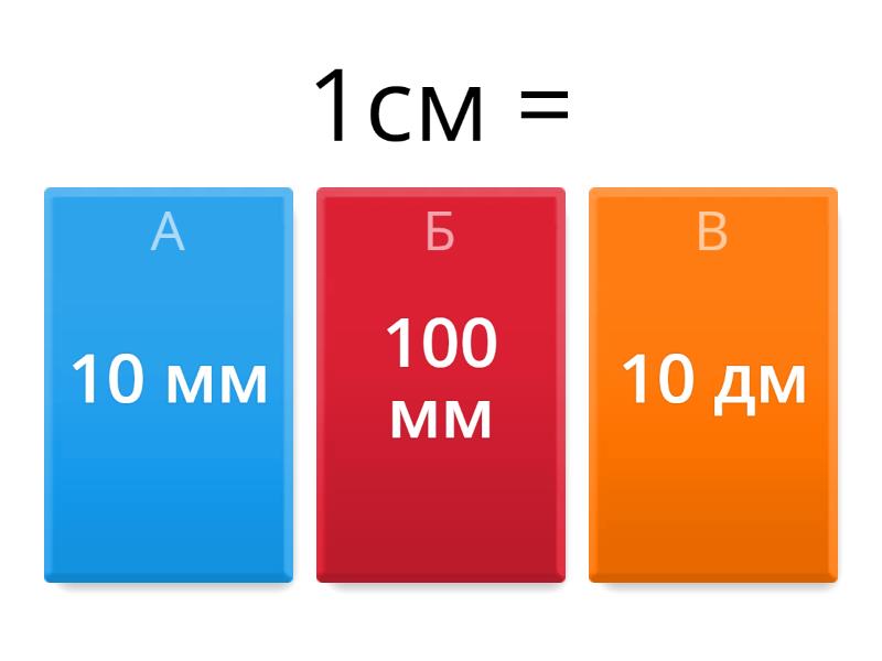 1) 1см = a) 10 мм b) 100 мм c) 10 дм 2) 1 дм= a) 10м b) 10мм c) 10см 3) 1м = a) 1000 см b) 100 см c) 100 дм 4) 12см = a) 1дм 2см b) 1мм 2см c) 10дм 5) 22мм = a) 2дм 2см b) 2см 2мм c) 1см 2мм 6) 6дм= a) 60м b) 6см c) 60см 7) 300 см = a) 3м b) 3дм c) 30м
