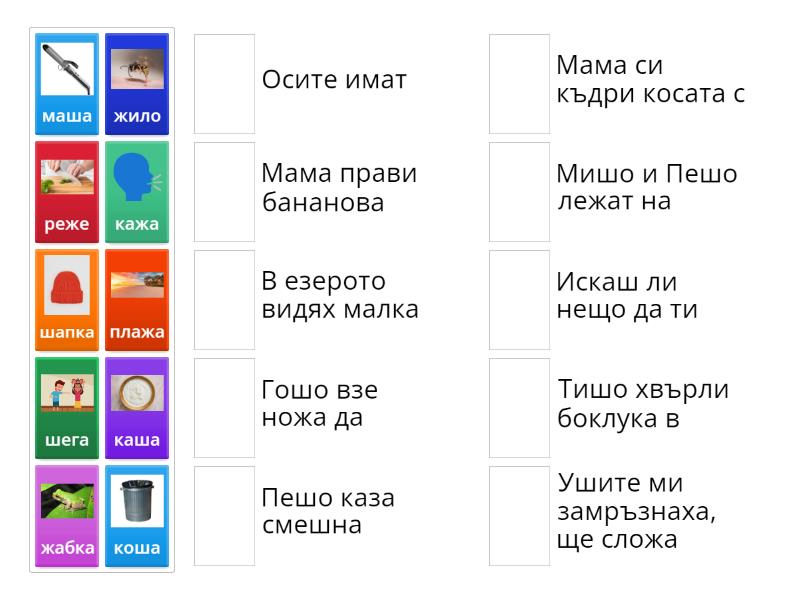 реже - Гошо взе ножа да , плажа - Мишо и Пешо лежат на, коша - Тишо хвърли боклука в , шапка - Ушите ми замръзнаха, ще сложа, кажа - Искаш ли нещо да ти, каша - Мама прави бананова, жило - Осите имат, маша - Мама си къдри косата с , жабка - В езерото видях малка, шега - Пешо каза смешна,