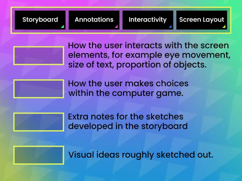 Interactivity - How the user makes choices within the computer game., Screen Layout - How the user interacts with the screen elements, for example eye movement, size of text, proportion of objects. , Storyboard - Visual ideas roughly sketched out., Annotations - Extra notes for the sketches developed in the storyboard,