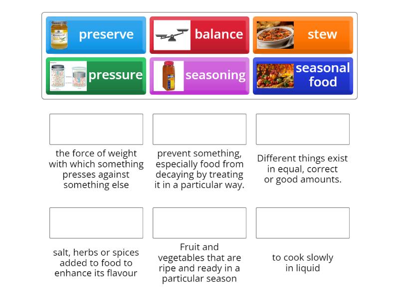 seasonal food - Fruit and vegetables that are ripe and ready in a particular season, balance - Different things exist in equal, correct or good amounts., preserve - prevent something, especially food from decaying by treating it in a particular way., stew - to cook slowly in liquid, pressure - the force of weight with which something presses against something else, seasoning - salt, herbs or spices added to food to enhance its flavour,