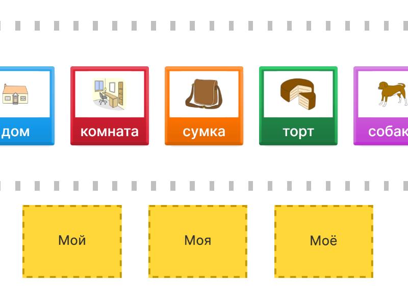 Мой: город, стол, стул, дом, кот, зонт, карандаш, шарф, стакан, автобус, торт, сок, врач, Моя: страна (country), комната, рука, полка, бумага, собака, рубашка, шапка, машина, ручка, сумка, ложка, Моё: молоко, окно, яблоко,