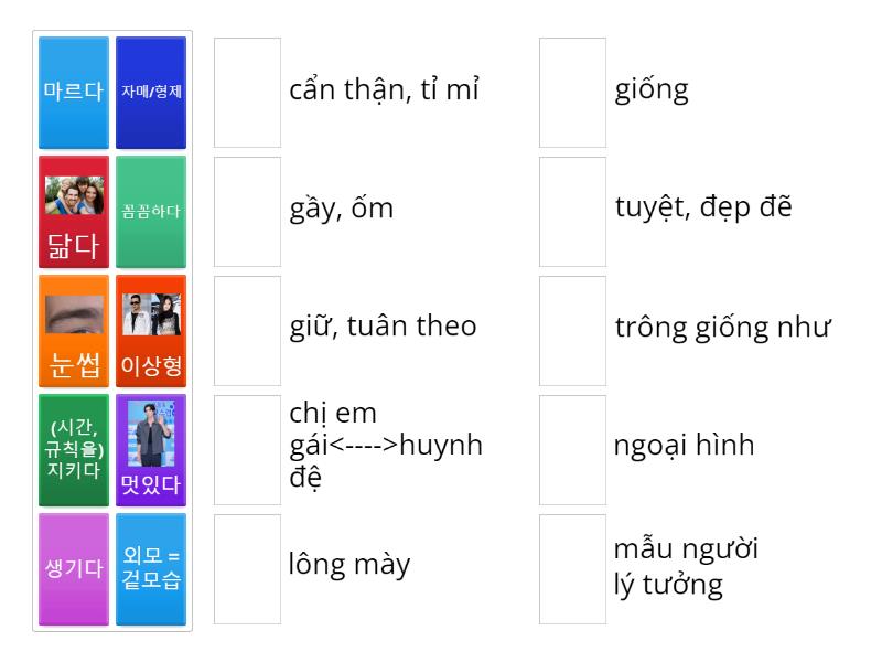 눈썹 - lông mày, 진하다<-->연하다 - đậm, sẫm, sậm<---->nhạt, nhẹ, 쌍꺼풀 - hai mí, 입술 - môi, 두껍다<--> 얇다 - dày<--->mỏng, 넓다<-->좁다 - rộng<--->hẹp, 이마 - trán, 어깨 - vai, 성격 - tính cách, tính nết, 활발하다 - hoạt bát, 내성적이다 - sự kín đáo, 꼼꼼하다 - cẩn thận, tỉ mỉ, 남성적이다<-->여성적이다 - nam tính<--->nữ tính, 성격이 급하다 - tính nóng vội, 날씬하다<--> 뚱뚱하다 - mảnh mai<---->béo, mập, 멋있다 - tuyệt, đẹp đẽ, 똑똑하다 - rõ ràng, rõ rệt, 어리다<-->늙다 - nhỏ tuổi<---->già, 어른 - người lớn, 생기다 - trông giống như, 모델 - người mẫu, 친하다 - gần gũi, 자매/형제 - chị em gái<---->huynh đệ, 닮다 - giống, 마르다 - gầy, ốm, (시간, 규칙을) 지키다 - giữ, tuân theo, 정확하다 - chính xác, 글씨 - chữ viết, 이상형 - mẫu người lý tưởng, 외모 = 겉모습 - ngoại hình,