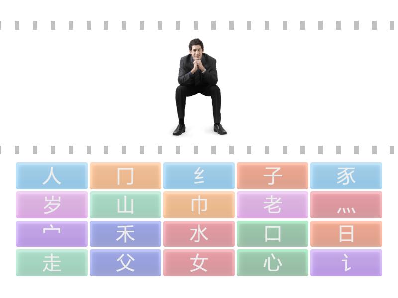 人, 女, 巾, 心, 老, 父, 山, 子, 讠, 豕, 水, 冂, 口, 岁, 禾, 走, 日, 宀, 纟, 灬,