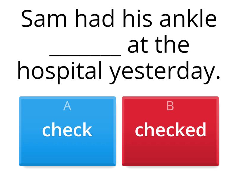 1) Sam had his ankle _______ at the hospital yesterday. a) check b) checked 2) I'm _______ my hair cut at the salon tomorrow. a) having b) have 3) We had our car _______by a mechanic last week. a) repair b) repaired 4) Ella ______ her wound cleaned by a nurse on Monday. a) had b) have