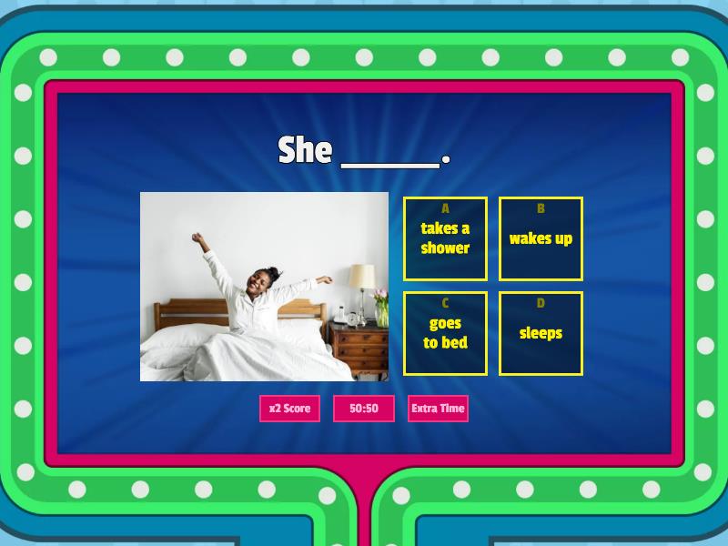 1) She ______. a) takes a shower b) wakes up c) goes to bed d) sleeps 2) He _________. a) wakes up b) makes the bed c) sleeps d) gets up 3) He _____ his teeth in the bathroom. a) cleans b) washes c) brushes d) does 4) They _________. a) do the laundry b) clean the room c) do the dishes d) clean the bathroom 5) She ________ lunch at noon. a) have b) has c) is d) does 6) They _______ dinner at home. a) do b) clean c) make d) has 7) He _______. a) cleans the trash b) has the trash c) washes the trash d) takes out the trash 8) He ______ his hair. a) brushes b) combs c) cleans d) has 9) She ____ her hair. a) combs b) cleans c) washes d) brushes 10) She ______ the laundry. a) has b) folds c) takes d) makes