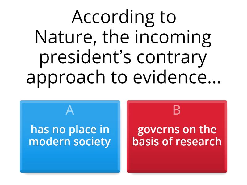1) According to Nature, the incoming president’s contrary approach to evidence...  a) has no place in modern society b) governs on the basis of research 2) The article presents that during Trump's first term... a) the government ignored and undermined efforts to address some of the world’s greatest problems b) researchers participated in the US federal science agencies replacing lobbyists and political appointees 3) How does the research community feel about his reelection? a) They believe it facilitates the country's reason, knowledge and civility b) Many are in despair 4) According to the article, policymakers... a) retain control over decision-making b) retain control over facts 5) During the past four years, the United States... a) has stood still as global temperatures continue to increase b) enacted policies to support industries and communities through the coming sustainability transition 6) The previous Trump administration’s decided to... a) exit the 2015 Paris climate agreement b) defund the World Health Organization 7) Epidemiologists, clinicians and logistics personnel are helping to treat and control diseases... a) present in Afghanistan, Ukraine, Sudan and Yemen b) that threaten the entire world 8) Scientists in the United States must know... a) they are not alone b) they won't have many challenges