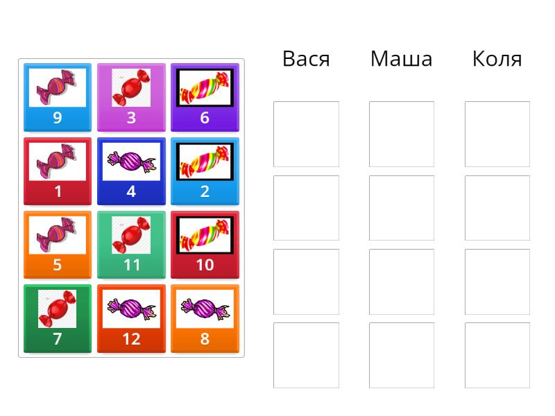 Вася: 1, 2, 3, 4, Маша: 5, 6, 7, 8, Коля: 9, 10, 11, 12,