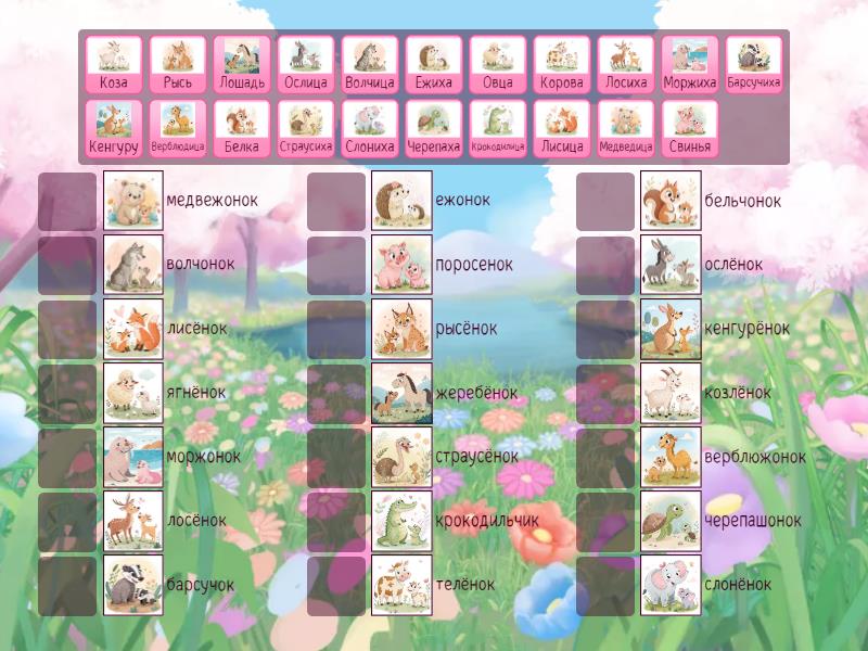 Медведица - медвежонок, Волчица - волчонок, Лисица - лисёнок, Овца - ягнёнок, Моржиха - моржонок, Лосиха - лосёнок, Барсучиха - барсучок, Ежиха - ежонок, Свинья - поросенок, Рысь - рысёнок, Лошадь - жеребёнок, Страусиха - страусёнок, Крокодилица - крокодильчик, Корова - телёнок, Белка - бельчонок, Ослица - ослёнок, Кенгуру - кенгурёнок, Коза - козлёнок, Верблюдица - верблюжонок, Черепаха - черепашонок, Слониха - слонёнок,