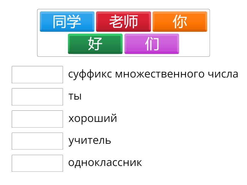 你 - ты, 好 - хороший, 老师 - учитель, 同学 - одноклассник, 们 - суффикс множественного числа,