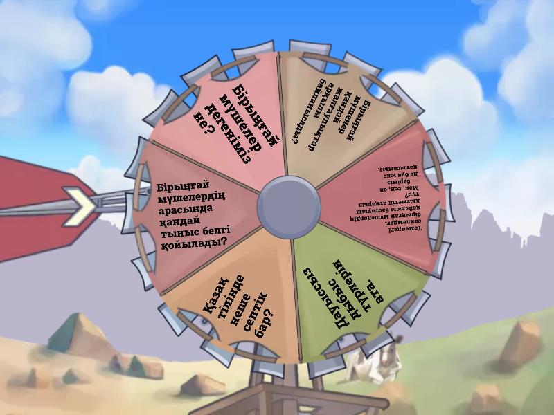 1) Бірыңғай мүшелер дегеніміз не? 2) Бірыңғай мүшелер қандай жалғаулықтар арқылы байланысады? 3) Төмендегі сөйлемдегі бірыңғай мүшелердің қайсысы бастауыш қызметін атқарып тұр? Мен, сен, ол — бәріміз де бұл іске қатысамыз. 4) Дауыссыз дыбыс түрлерін ата. 5) Қазақ тілінде неше септік бар? 6) Бірыңғай мүшелердің арасында қандай тыныс белгі қойылады?