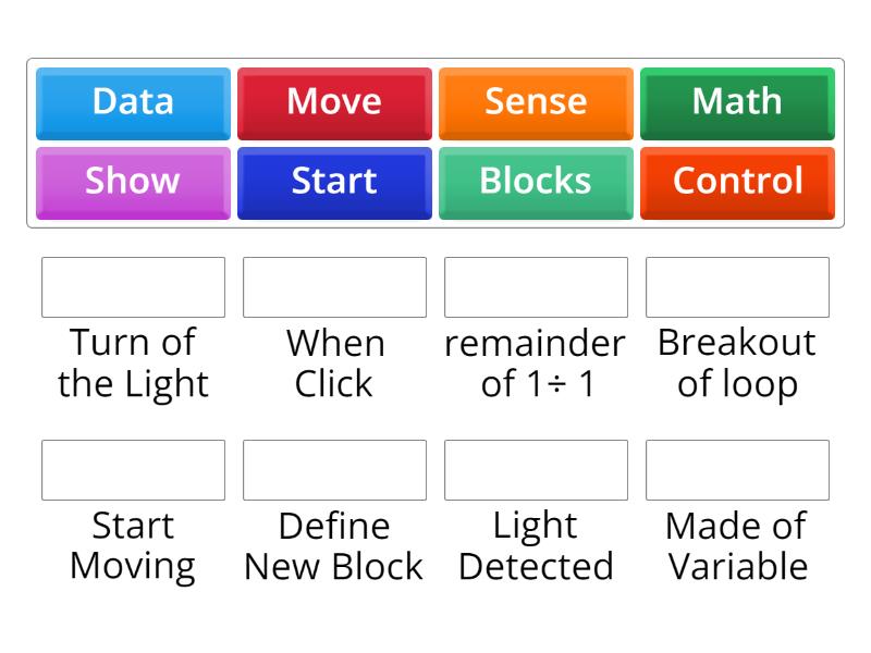 Blocks - Define New Block, Math - remainder of 1÷ 1, Control - Breakout of loop, Data - Made of Variable, Sense - Light Detected, Show - Turn of the Light, Start - When Click, Move - Start Moving,