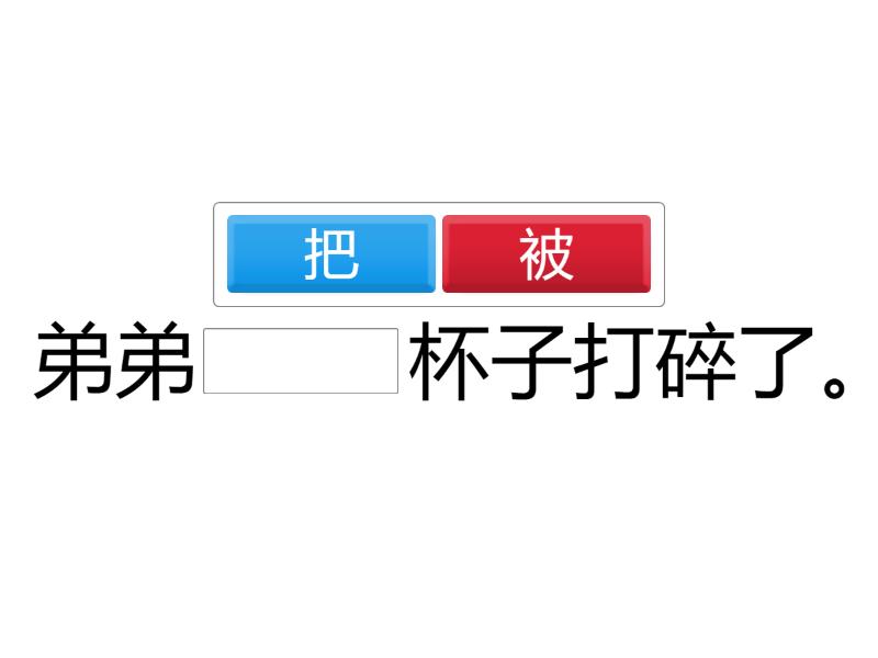 弟弟____杯子打碎了。 早上,我____鬧鐘吵醒了。 今天,班上的同學____老師罰站了。 小明____媽媽的錢包弄丟了。 冰箱裏的食物____弟弟吃個清光。 衣櫃裏的舊衣服____媽媽扔掉了。 樹上的葉子____秋風吹落。