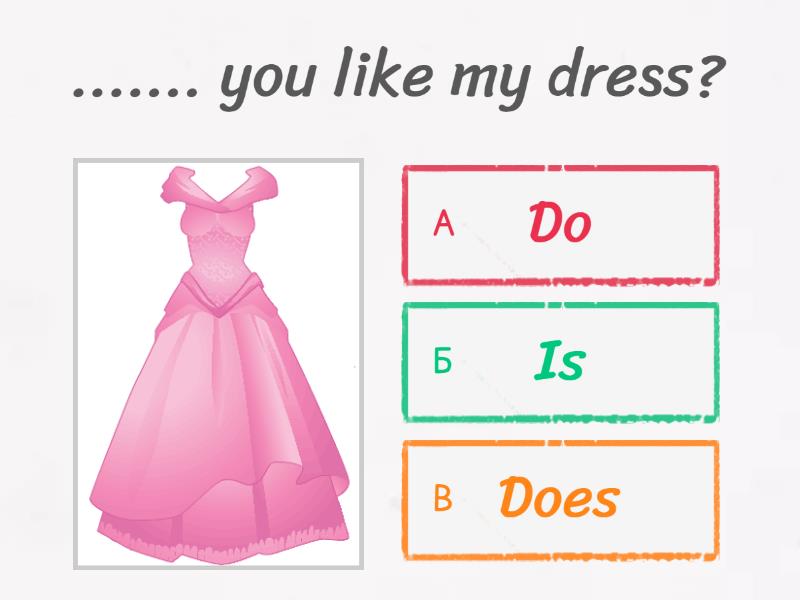 1) ....... you like my dress? a) Do b) Is c) Does 2) ..... ruler is this? It's mine. a) Whose b) Who's c) Who 3) Does he work in a shop? No he ..... a) don't b) doesn't c) isn't 4) Mrs Green doesn't teach French. She ..... Science. a) teach b) teaching c) teaches 5) Daniya ...... basketball. a) doesn't like b) isn't like c) don't like 6) .... Ulan? He is my cousin. a) Whose b) Who's c) Who 7) Do you like..... films on TV? Yes, I do. a) Watching b) watch c) watches 8) Those are..... pens.  a) Sultan's b) Sultans c) Sultans' 9) Lilly alway......an umbrella. a) carry b) carries c) carrys 10) Do you go jogging in the morning? Yes, ........ a) I am b) we are c) we do 11) Miras loves ...... badminton. a) plays b) play c) playing 12) Nurislam............ walk to school. a) don't b) isn't c) doesn't