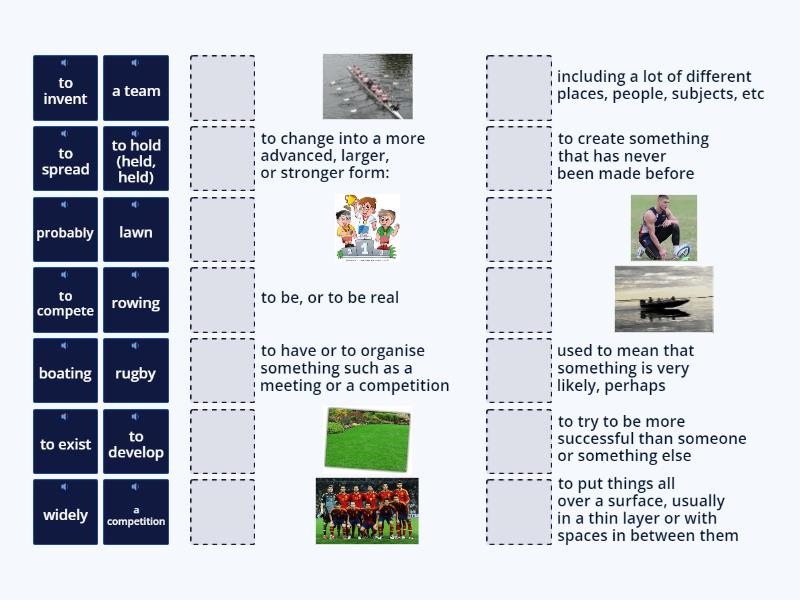 boating, rowing, rugby, lawn, to spread - to put things all over a surface, usually in a thin layer or with spaces in between them, to compete - to try to be more successful than someone or something else, a competition , probably - used to mean that something is very likely, perhaps, a team , to invent - to create something that has never been made before, to exist - to be, or to be real, widely - including a lot of different places, people, subjects, etc, to hold (held, held) - to have or to organise something such as a meeting or a competition, to develop - to change into a more advanced, larger, or stronger form:,
