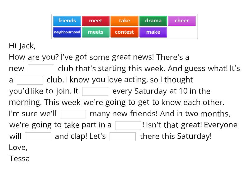 Hi Jack, How are you? I’ve got some great news! There’s a new ____ club that’s starting this week. And guess what! It’s a ____ club. I know you love acting, so I thought you’d like to join. It ____ every Saturday at 10 in the morning. This week we’re going to get to know each other. I’m sure we’ll ____ many new friends! And in two months, we’re going to take part in a ____! Isn’t that great! Everyone will ____ and clap! Let’s ____ there this Saturday! Love, Tessa