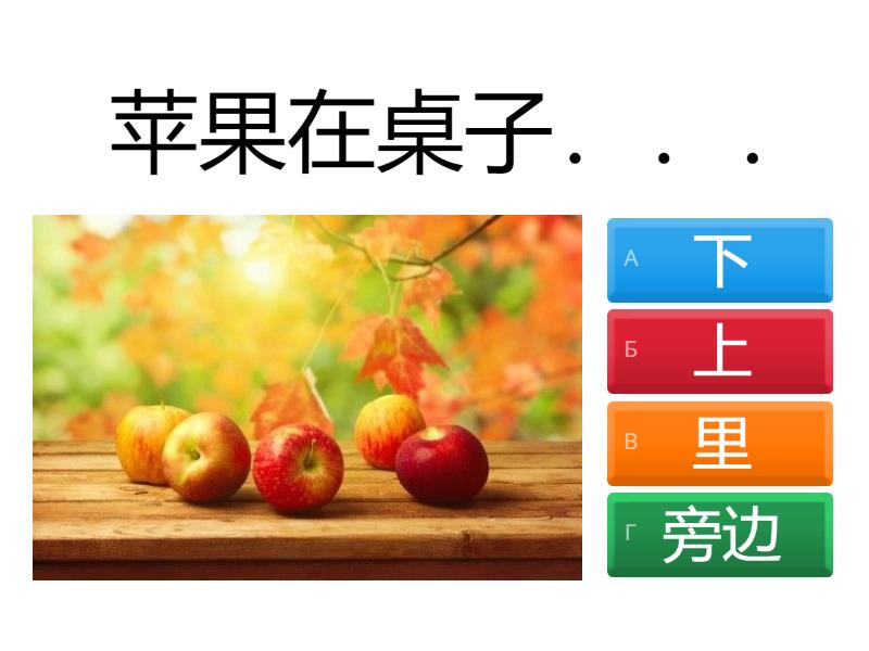 1) 苹果在桌子... a) 下 b) 上 c) 里 d) 旁边 2) 孩子在湖... a) 下 b) 上 c) 里 d) 旁边 3) 花在手... a) 下 b) 上 c) 里 d) 旁边 4) 狗在桌子... a) 下 b) 上 c) 里 d) 旁边 5) 猫在椅子... a) 下 b) 上 c) 里 d) 旁边 6) 他们在学校... a) 下 b) 上 c) 里 d) 旁边 7) 他在家... a) 下 b) 上 c) 里 d) 旁边 8) 鞋在床... a) 下 b) 上 c) 里 d) 旁边