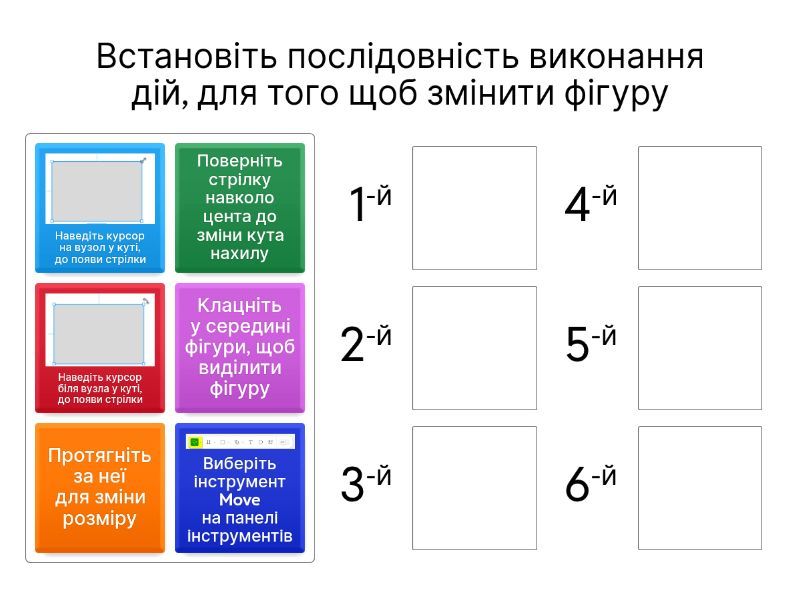 : Виберіть інструмент Move на панелі інструментів, Клацніть у середині фігури, щоб виділити фігуру, Наведіть курсор на вузол у куті, до появи стрілки, Протягніть за неї для зміни розміру, Наведіть курсор біля вузла у куті, до появи стрілки, Поверніть стрілку навколо цента до зміни кута нахилу,