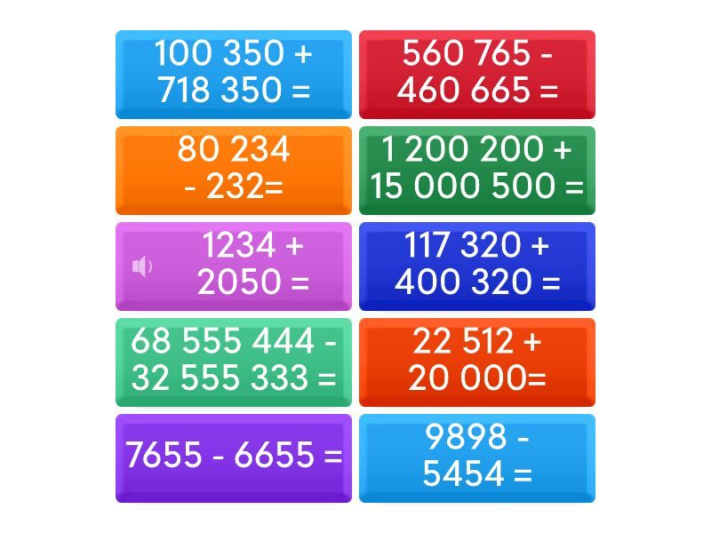 1234 + 2050 = - 3284, 80 234 - 232= - 80 002, 22 512 + 20 000= - 42 512, 68 555 444 - 32 555 333 = - 36 000 111, 117 320 + 400 320 = - 517 640, 100 350 + 718 350 = - 818 700, 560 765 - 460 665 = - 100 100, 1 200 200 + 15 000 500 = - 16 200 700, 9898 - 5454 = - 4444, 7655 - 6655 = - 1000,