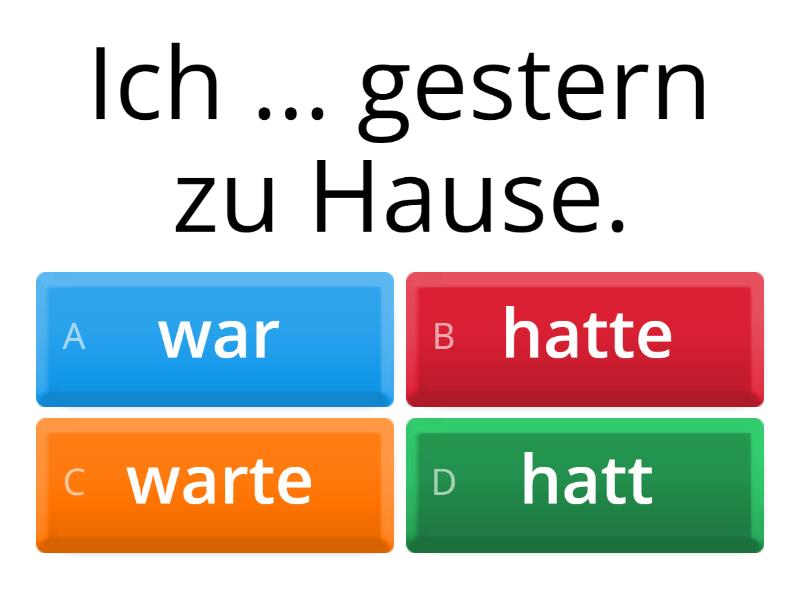 1) Ich ... gestern zu Hause. a) war b) hatte c) warte d) hatt 2) Mein Vater ... am Montag viel Arbeit. a) war b) hatte c) warte d) hatt 3) Mein Bruder... gestern auch zu Hause. a) warte b) hatte c) war d) hatt 4) Als Kind ... ich keine Brille. a) warte b) hatte c) war d) hatt 5) Wir ... in unserem Kinderzimmer. a) warte b) hatten c) war d) waren 6) Wo ... du am Wochenende? a) wartest b) hattet c) warst d) hattest 7) ... ihr genug Zeit? a) wartest b) hattet c) warst d) hattest 8) Ich ... mit meiner Familie zusammen. a) warte b) hatte c) war d) ware 9) Er ... kein Euros. a) warte b) hatte c) war d) ware 10) Wir ... 4 Stunden im Schwimmbad. a) warten b) hatten c) war d) waren 11) Ich ... keine Freizeit. a) warten b) hatte c) war d) hatten 12) Meine Mutter ... nicht in der Arbeit. a) wart b) hatte c) war d) waren 13) Meine Klasse ... in Großbritanien. a) warte b) hatte c) waren d) war 14) Ich ... nie in Belgien. a) hatte b) war c) warte d) hattest 15) Am Wochenende ... wir keine Hausaufgaben. a) hatten b) waren c) warte d) hattet 16) Im Sommer ... wir oft in Kroatien. a) hatte b) hatten c) warte d) waren 17) ... ihr schon in England in London? a) waren b) wart c) hattet d) hatte 18) Meine Freunde ... gestern im Restaurant. a) wart b) hatten c) waren d) warten